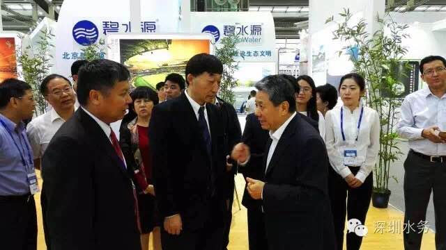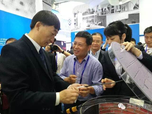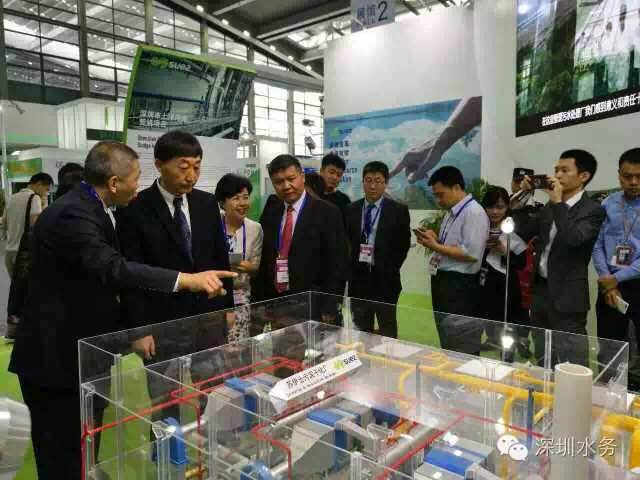 在水务局展厅,王立新向刘宁介绍深圳“治水提质”工作中的新技术和成果,以及深圳治水蓝图,对水质净化、污水污泥处理等一流的技术产品。