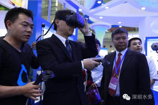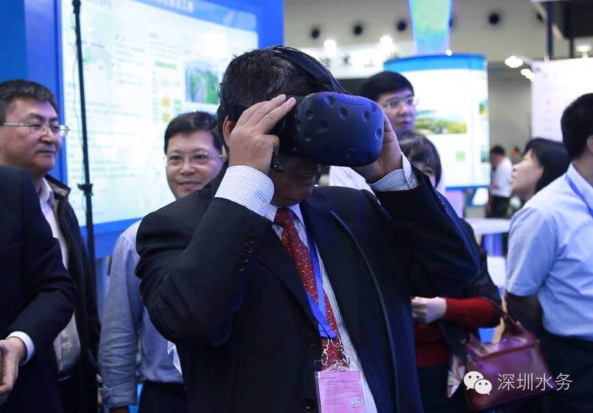 刘宁、王立新现场体验VR。刘宁表示,VR技术在未来智慧水务应用领域具有很好前景,希望深圳继续以科技引领治水工作。